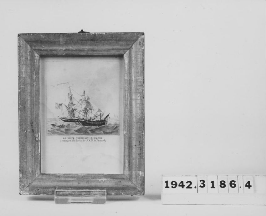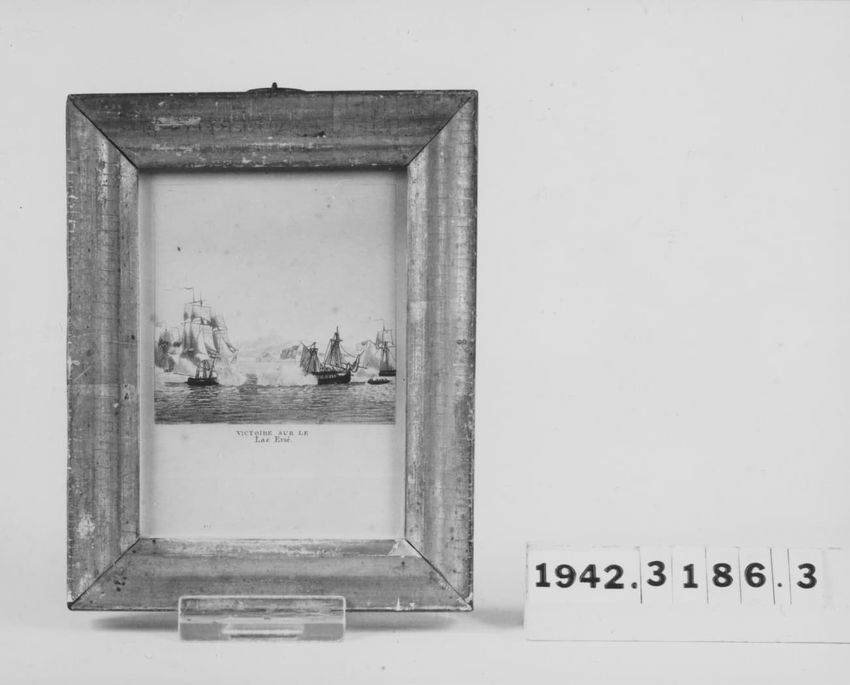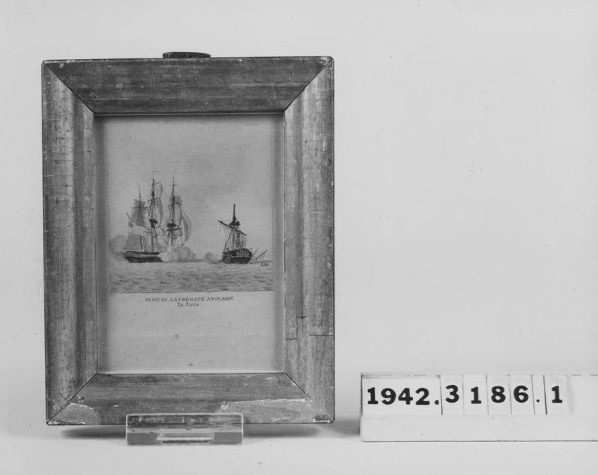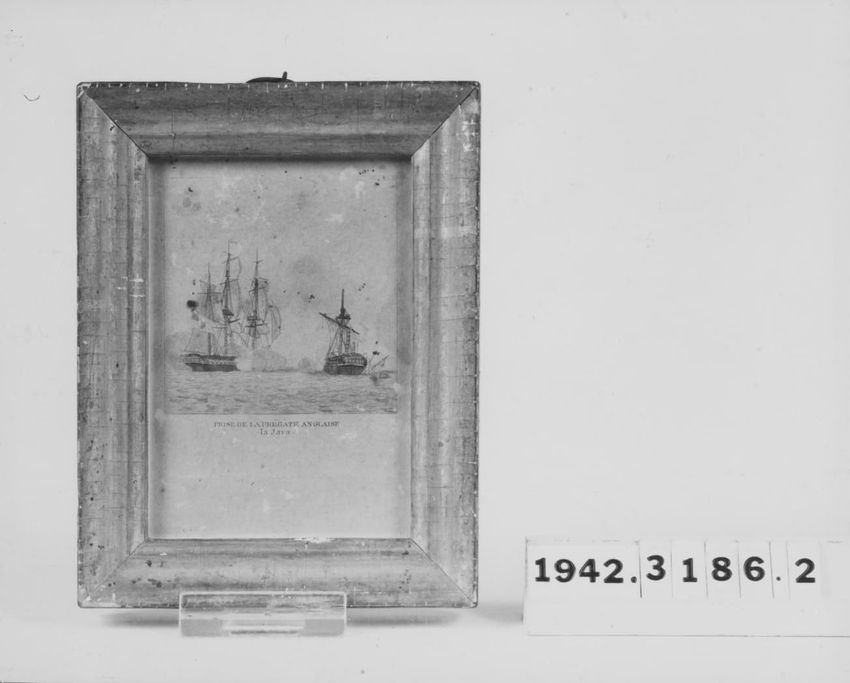 Marine scene with two ships in battle with a third ship to the right. Framed. One of a set of seven.