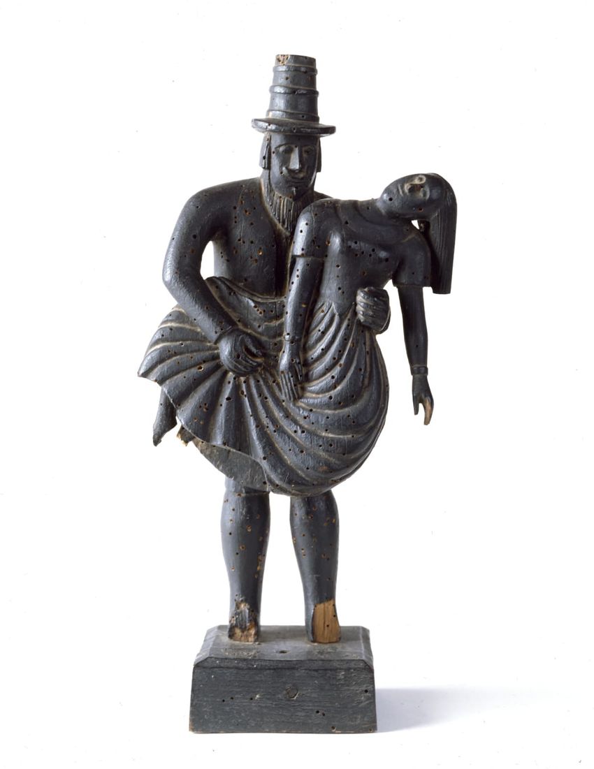 Folk art sculpture of a carved wooden man in top hat carrying an unconscious woman in arms; painted black.