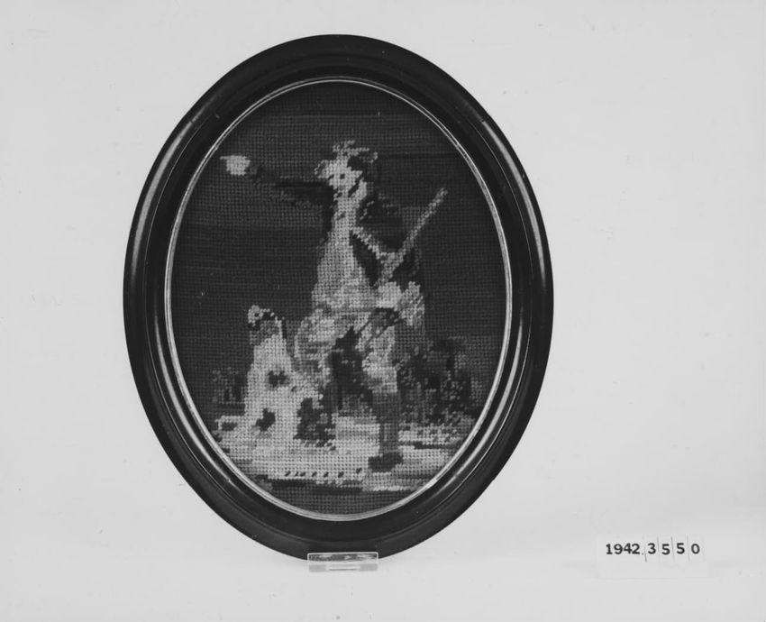 Needlework picture of a man wearing a green coat and brown breeches hunting with a dog. In an oval frame.