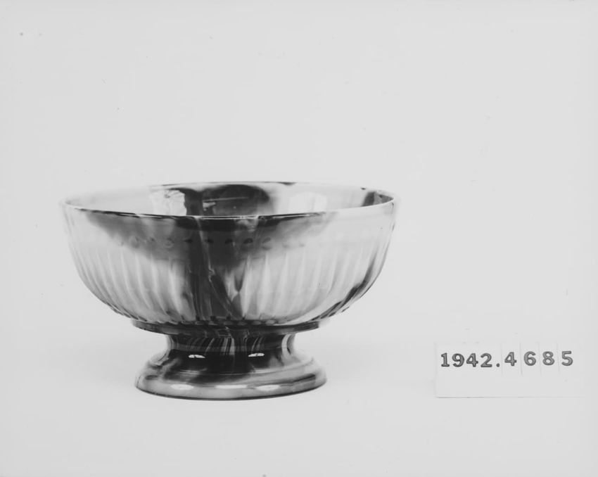 Purple and white swirled glass bowl with bead and facet decoration on the round foot.