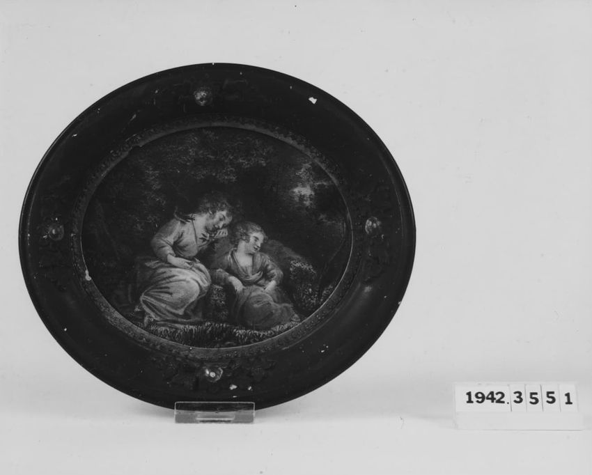 Miniature hand-colored print of two children asleep in woods in an oval frame.