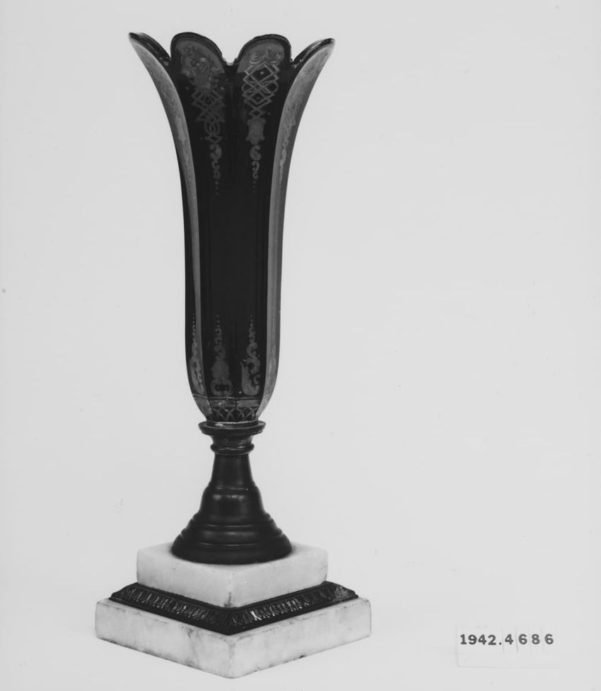 Etched ruby-colored fluted glass vase on a square marble and gilded metal base.