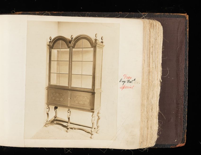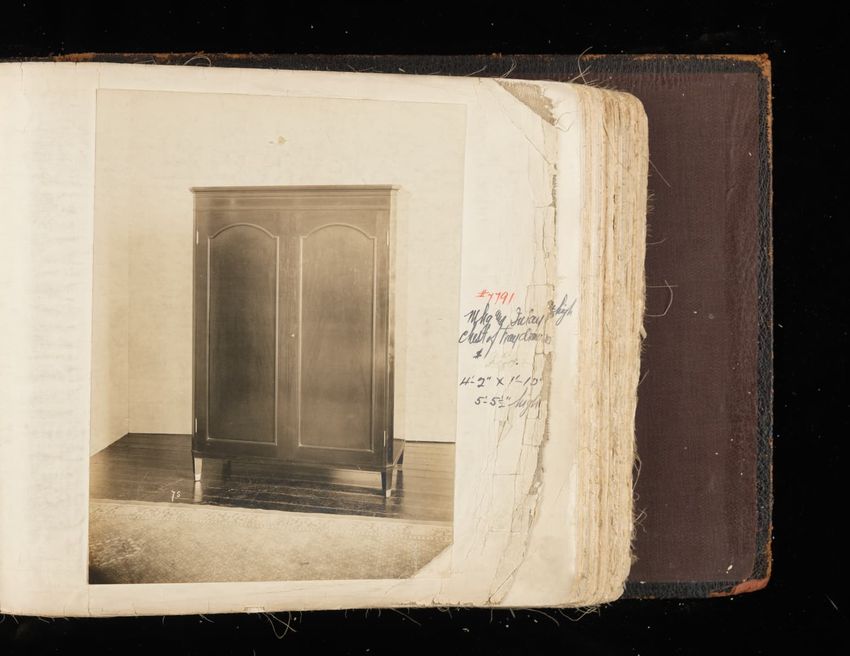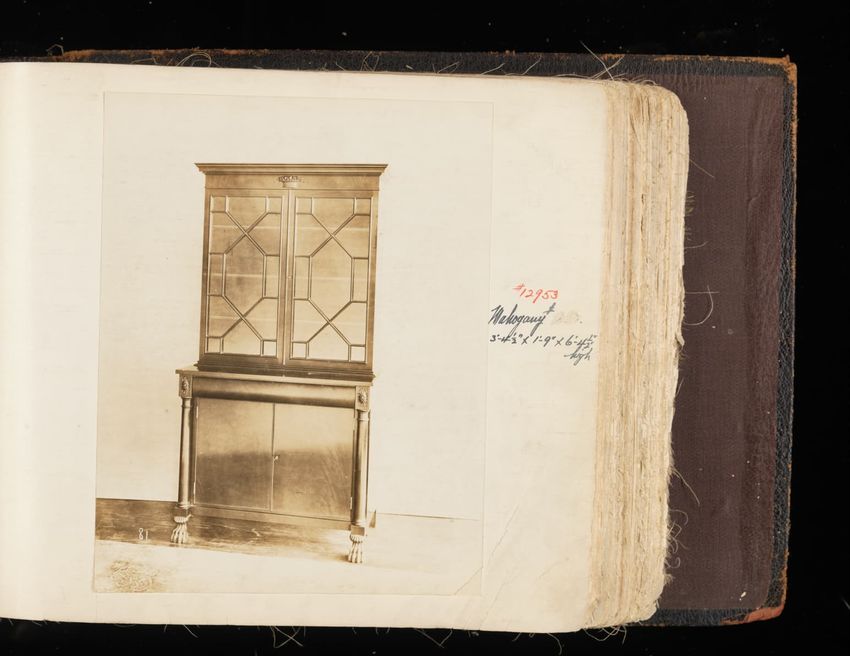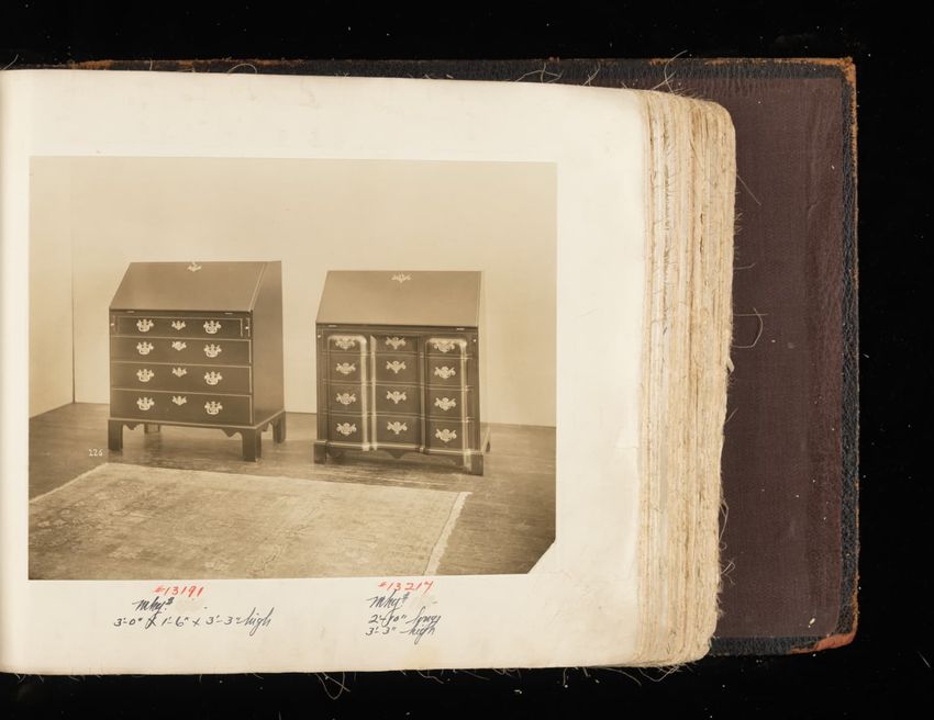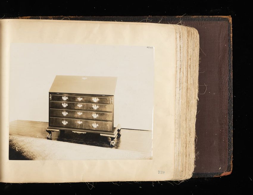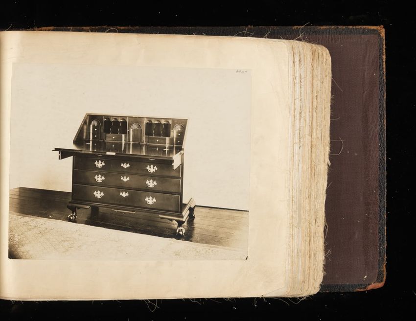 Black-and-white photograph of a desk. Chippendale-style desk has hinged slant-front which opens to reveal an interior writing surface, drawers and pigeonholes; two lopers with round pulls; four drawers with key escutcheons, bail handles and bat-wing plates; molded lower edge; center carved drop orna...