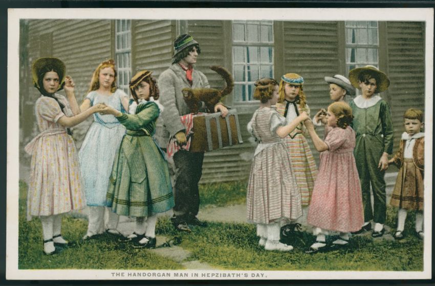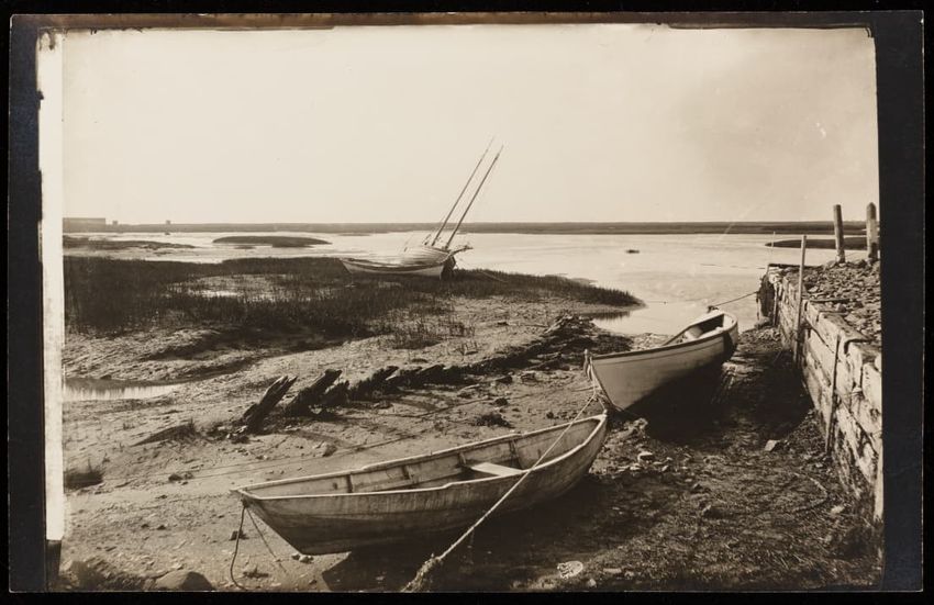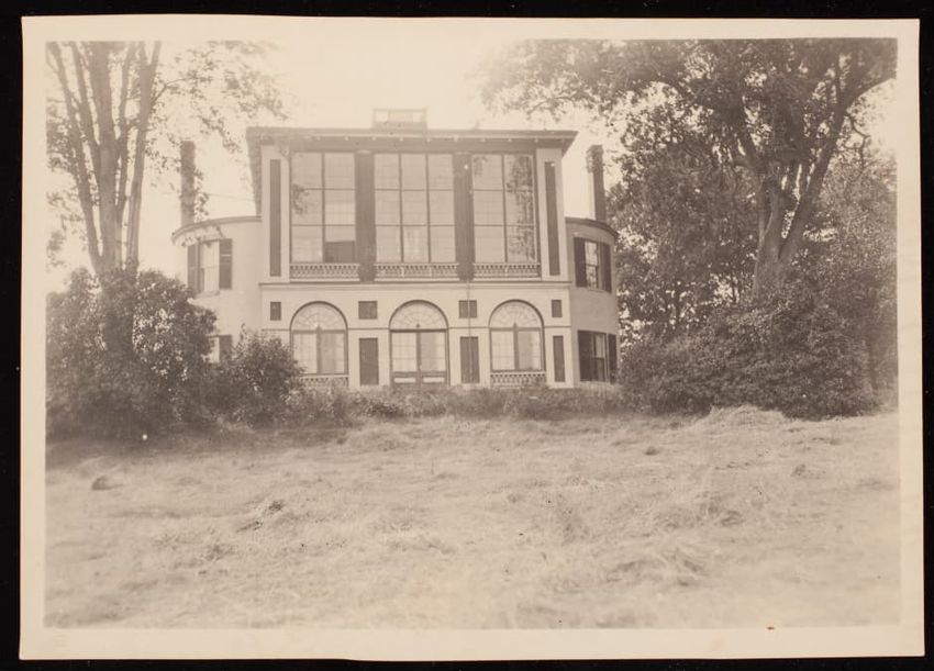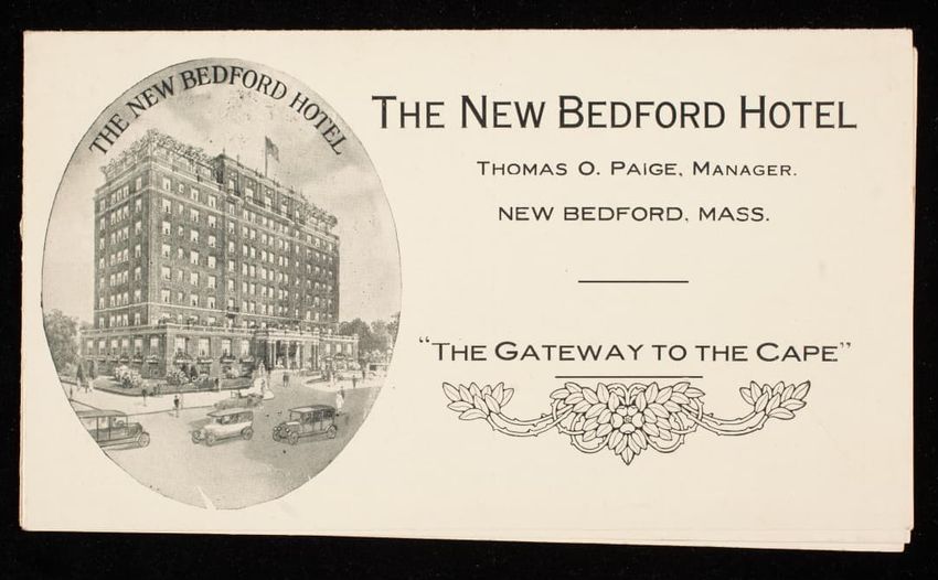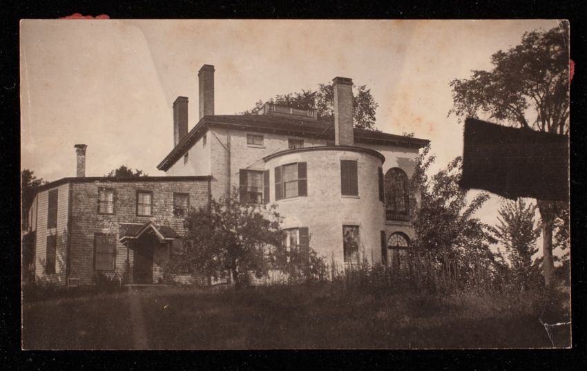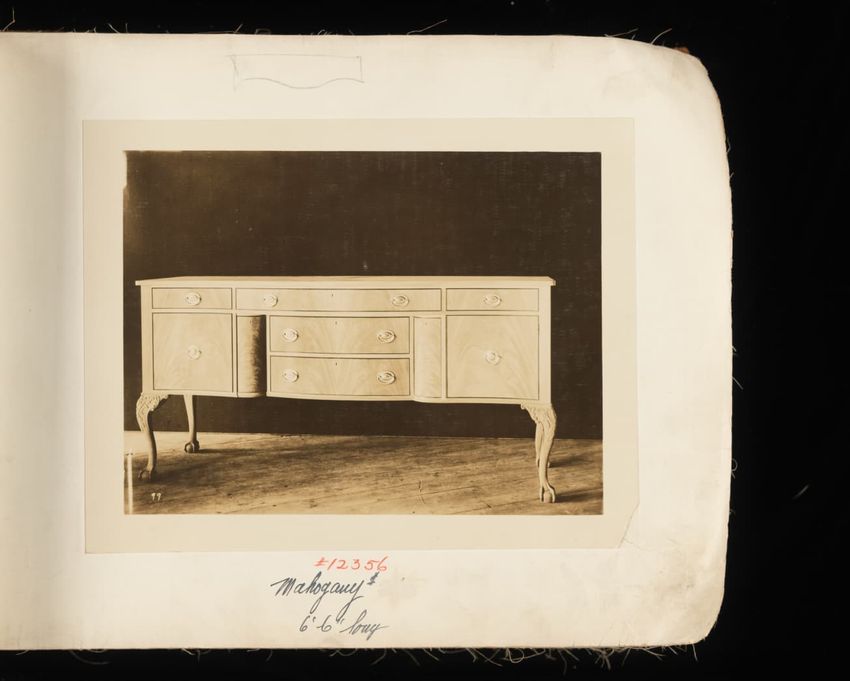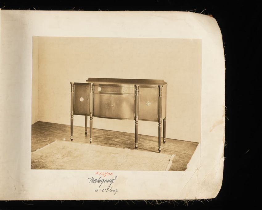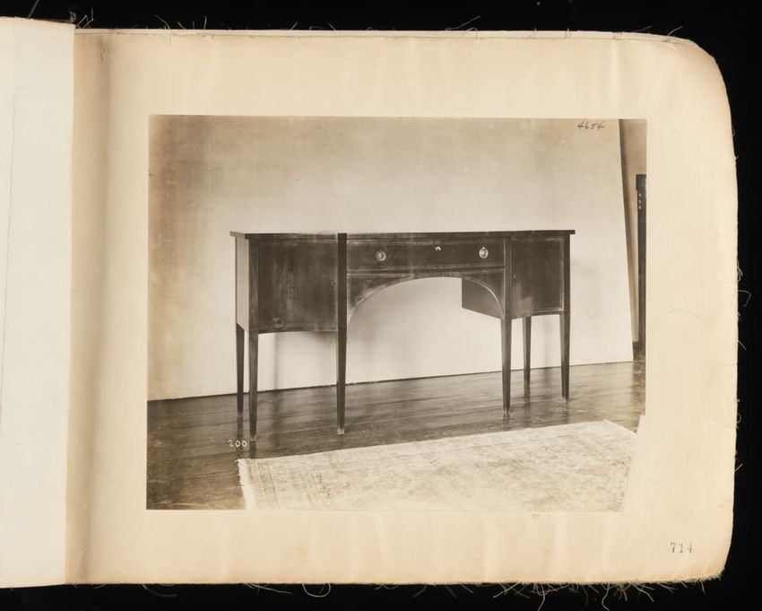Black-and-white photograph of a Neoclassical Hepplewhite-style sideboard. Sideboard has bowed front; overhanging top; splashboard with concave curved corners; two cupboards with doors and one center drawer; tapered square legs with cuffs. Inlaid decoration includes: string inlay on cabinet doors, dr...
