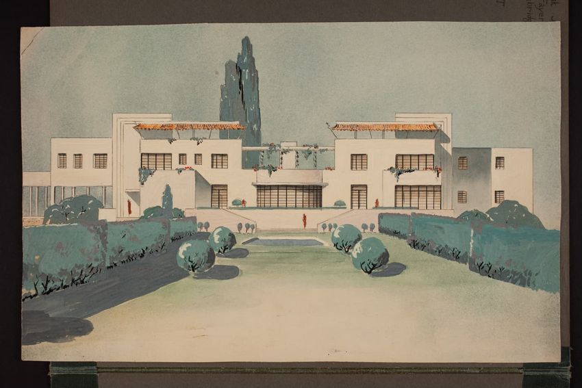 [Possibly early ideas for] Barrett residence, perspectives and floor plans, sent from Frank J. Barrett to Dorothy Barrett