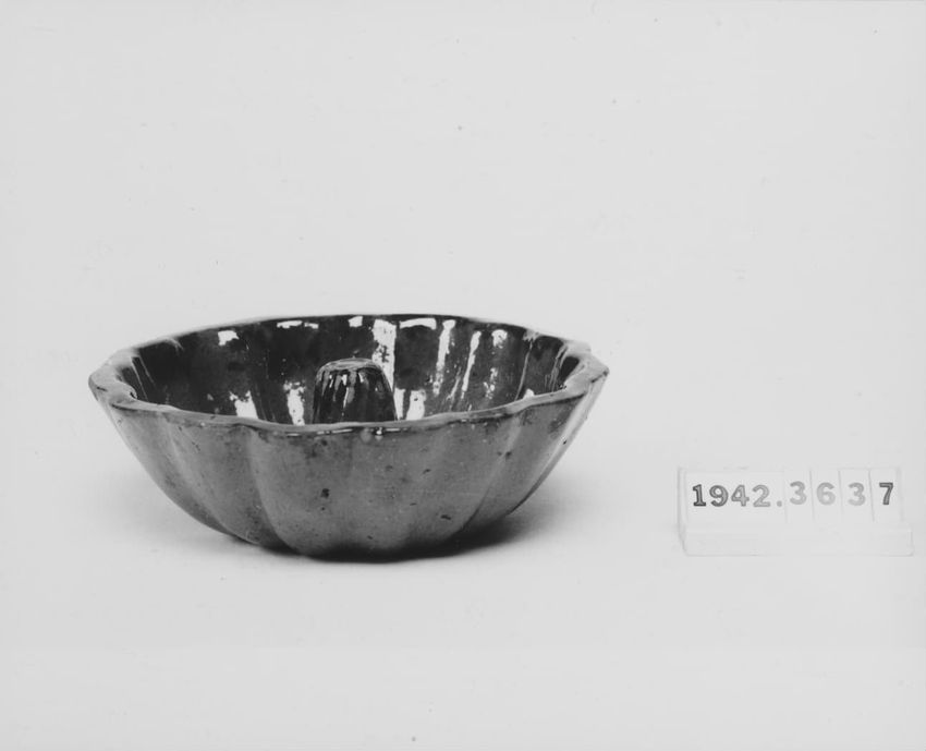Red and brown mold, ribbed with a center post and mottled glaze.