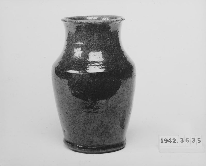 Brown vase with dark brown speckles, canted shoulders, a wide mouth, and a turned lip.