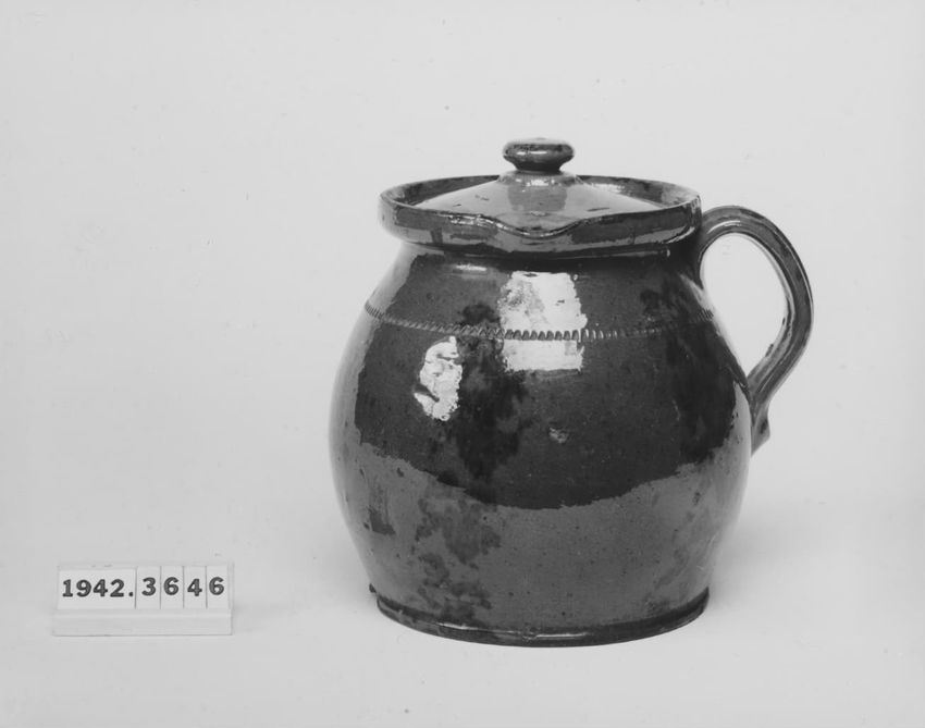 Red and brown crock with a bulbous body, a coggle band at the shoulder, a handle, and a lid with a knob.