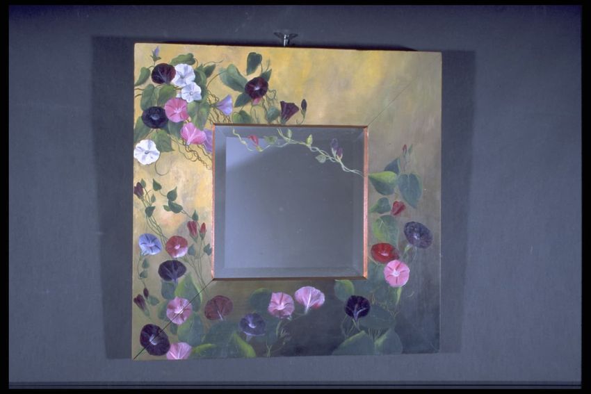 Painted mirror and frame; square wooden frame with smaller square mirror in center. Frame is painted with Japanesque floral vines of pink, purple, red and white morning glories; background shaded yellow and green.