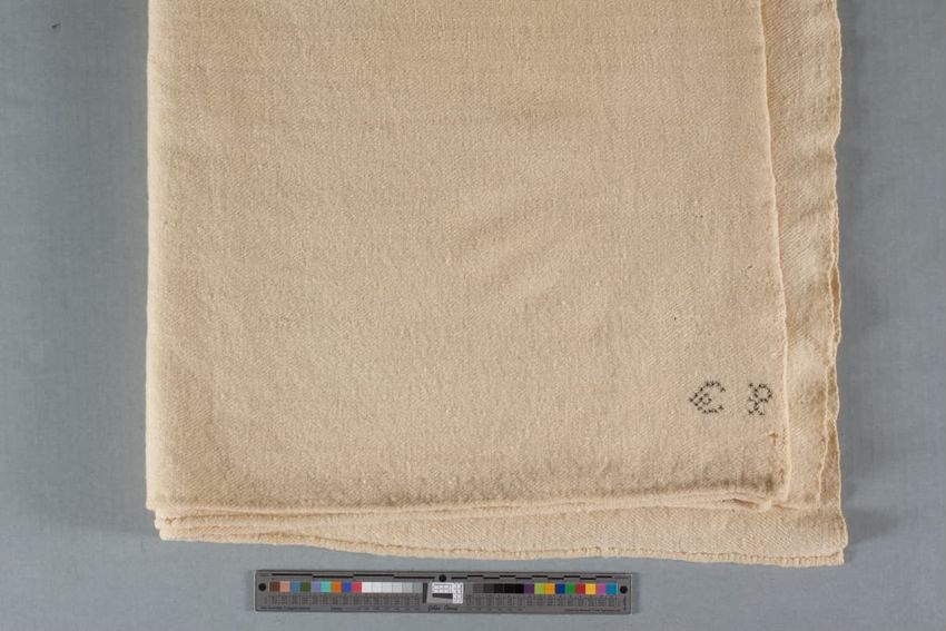 White, plain weave, lightly napped, seamed wool blanket with green zig-zag stitch binding across top and bottom; selvage edge with decorative two-thread wide blue edge; embroidered polychromatic wool floral motifs in corners of one end; blue selvages.