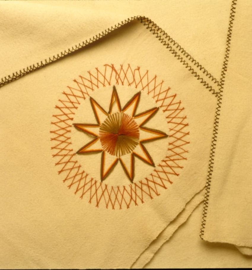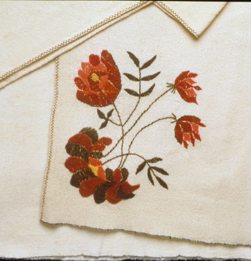 cross-stitching, embroidering, hand weaving, piecing, tabby (textile), wool (textile)