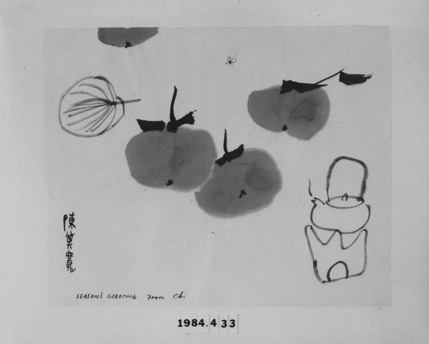 Bamboo fan; kettle over brazier; kumquats(?); gr-black with or. fruit