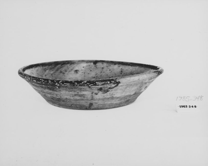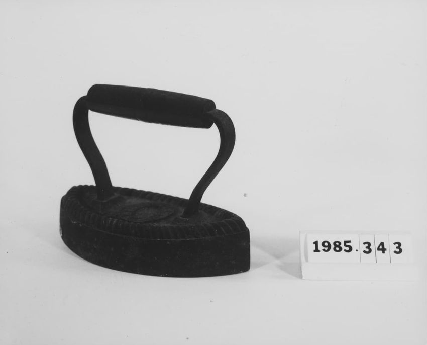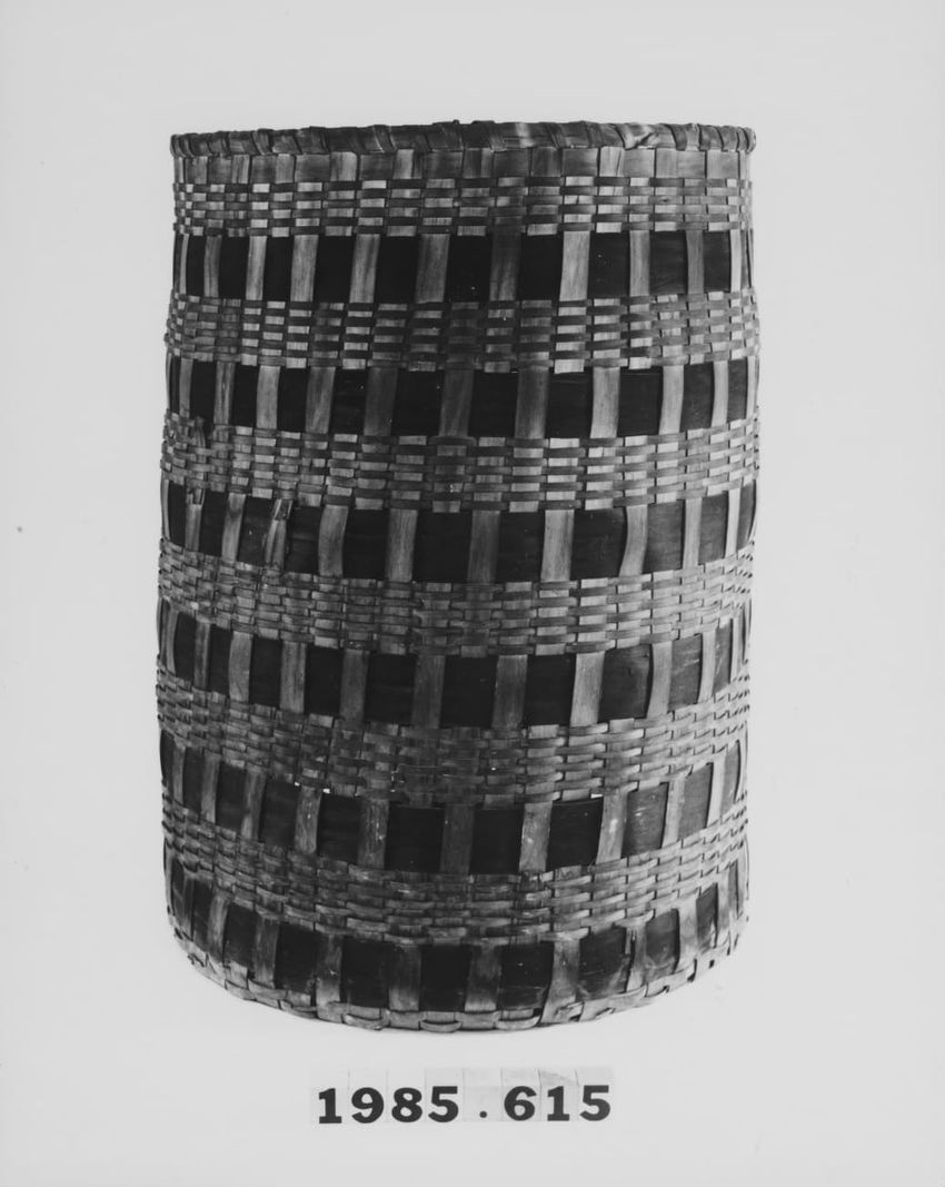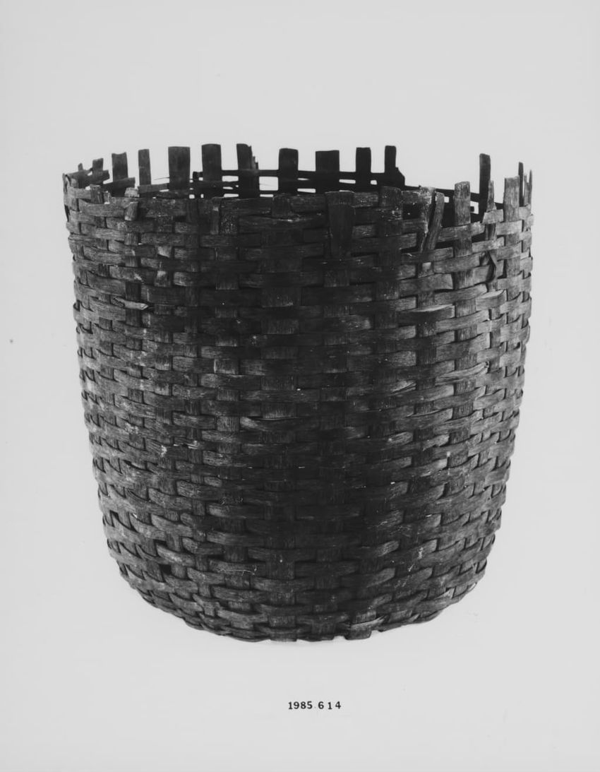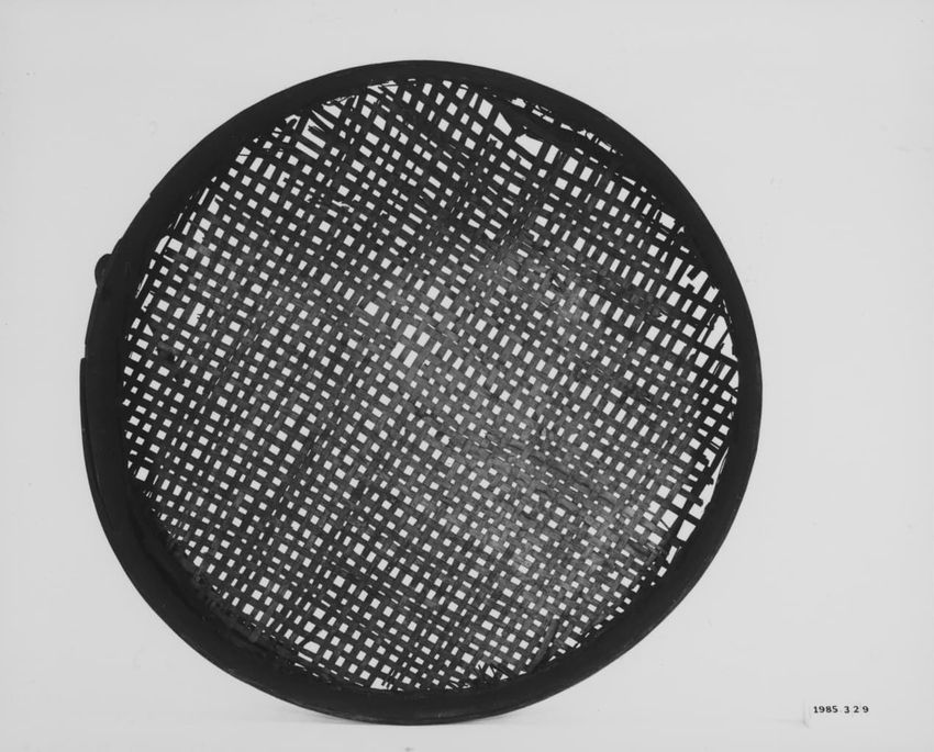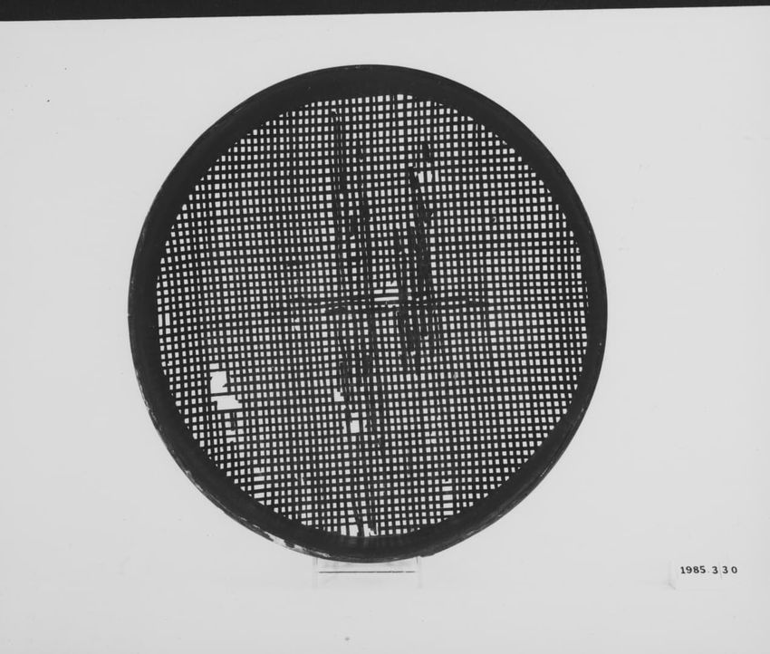 Three incised, turned, baluster and ring supports incised base stamped "WMA" and dated "1791" on rear face. Wheel has ten turned and incised spokes wrapped w/ two strips of bent wood. Single finger lap joint. Single-action spin w/ tapered metal spindle held by braided grass strands.