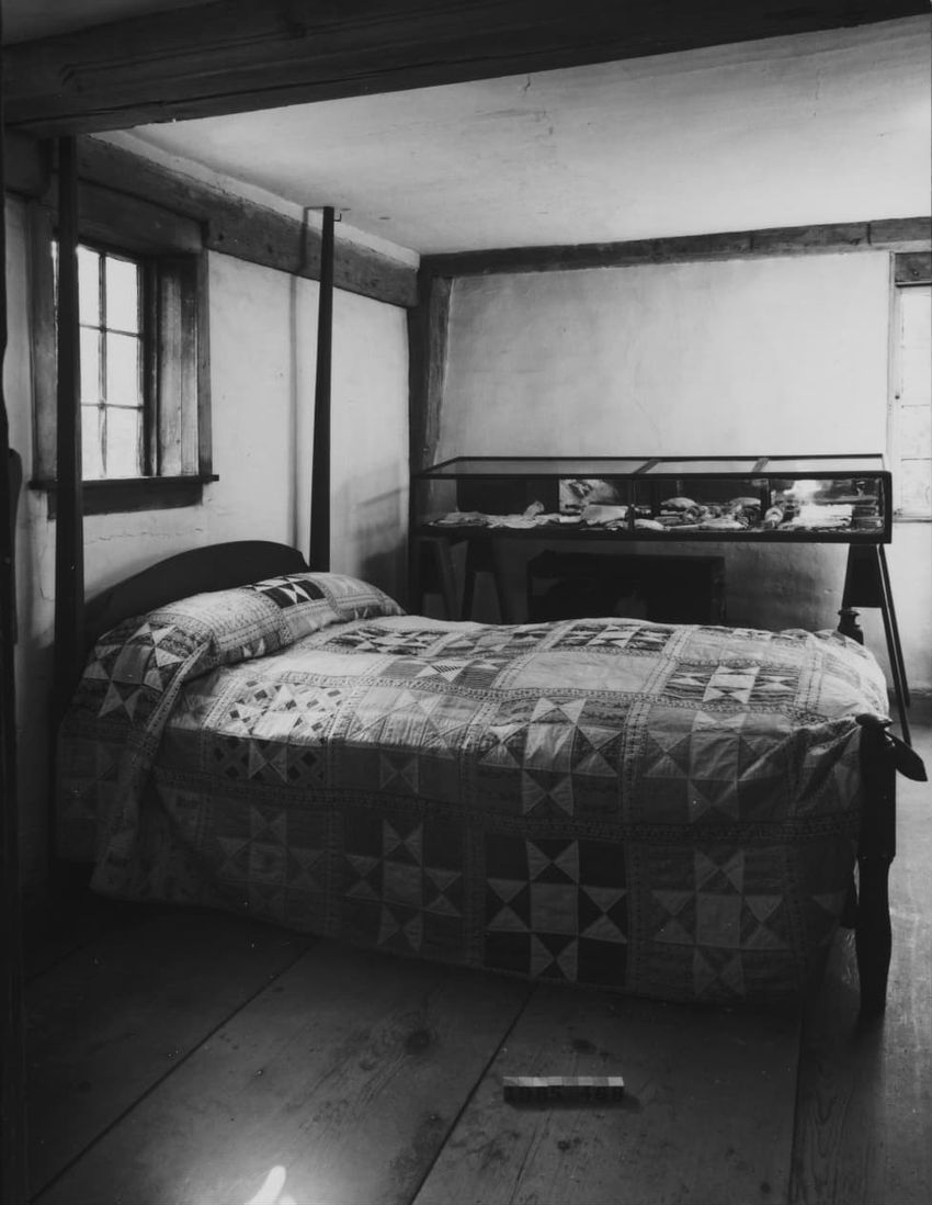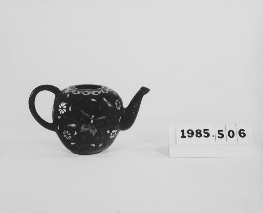 Trunk. Black, leather-covered rectangular trunk with brass studs and wrought iron handles. Interior lined with blue polkadot paper and has printed label: "M. Lord and Son...Newburyport, MA."