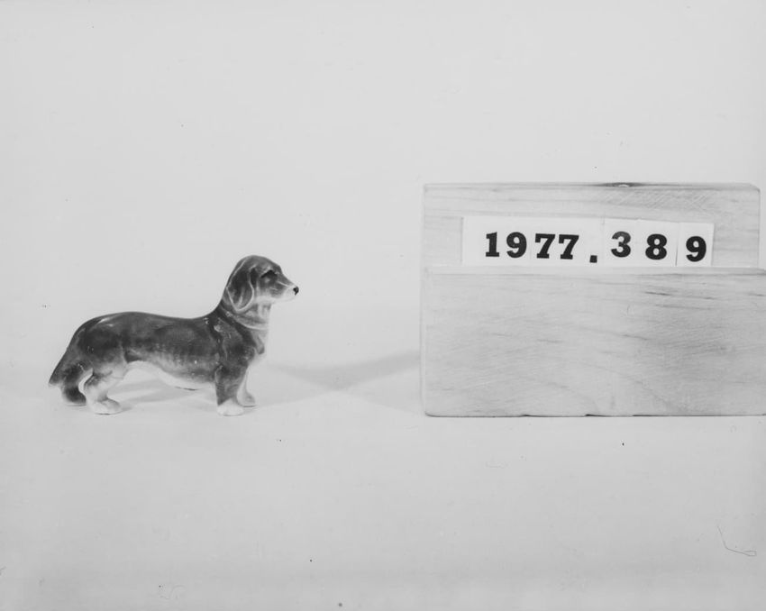 Molded figure of a peasant woman on a mound leaning against a tree stump; dressed in striped petticoat, tightly fitted blue bodice with gold fringe, pink and blue shoes, polka dotted dress, pink hat with rust, gold and white plume; applied oak leaves on stump; applied flowers and foliage on base; wh...