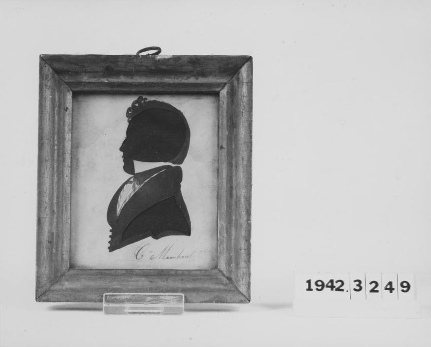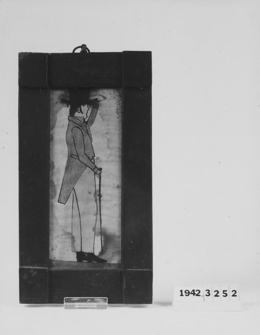 This double-cut (shoulder area cut separately from the head) silhouette is a bust-length profile of a man. The uncut areas of his coat, green waistcoat, stock (a type of neck tie that buckled in back), and hair are all detailed in watercolor and india ink.