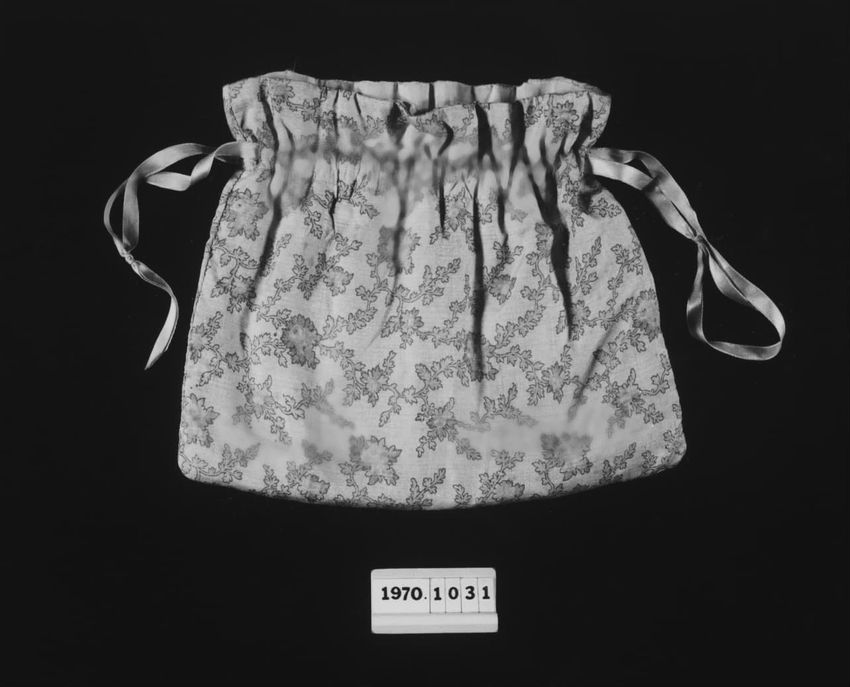 Drawstring; cream with pink flowers; blue and green detail; thread, scissors, etc. inside