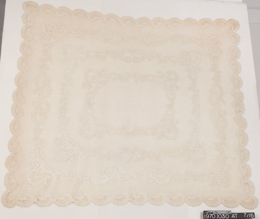 Openwork net; scrolled foliate pattrns. in rectangular bordrs; ivory