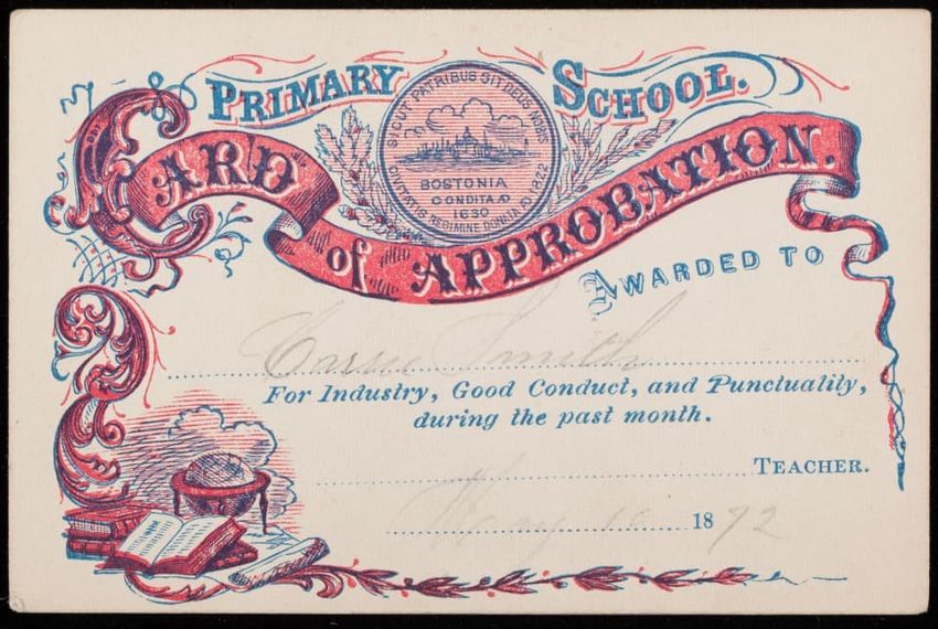 Books and an atlas decorate the card.