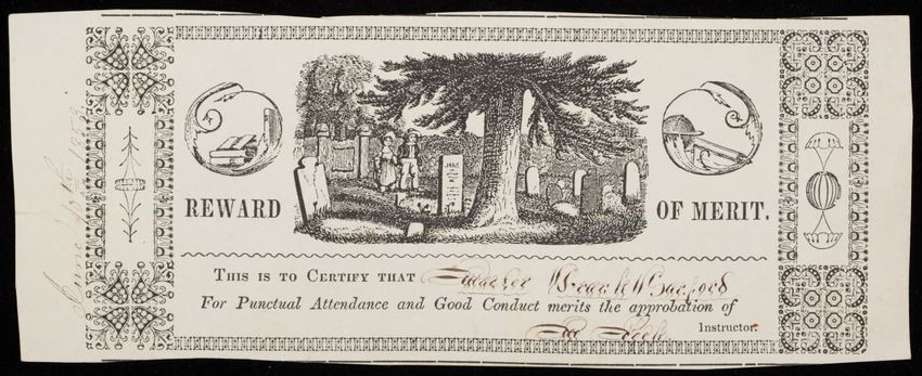 Text below the illustration reads "This is to certify that Master Frank Sanford for punctual attendance and good conduct merits the approbation of ... instructor." Two children visit a child's grave in the illustration. Handwritten text on the verso reads "Frank Sanford b. 1847 d. 1857."