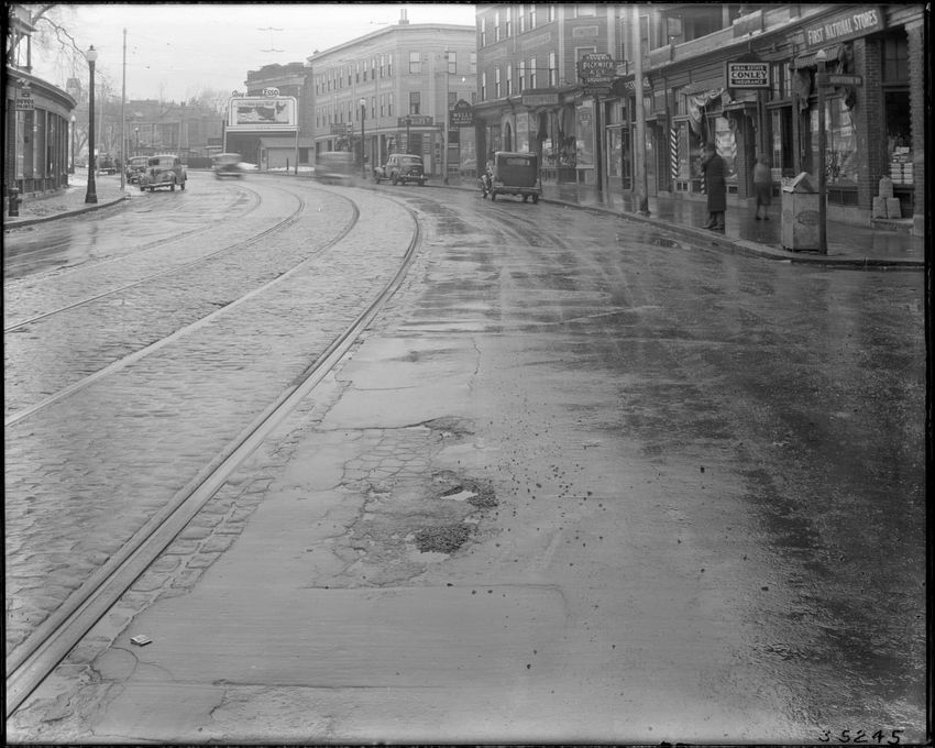 Near #57Q, near Oak Sq. First National Store. Community News Truck. 1938 Wallpaper Patterns. Street scene, vehicles, signs, shops.