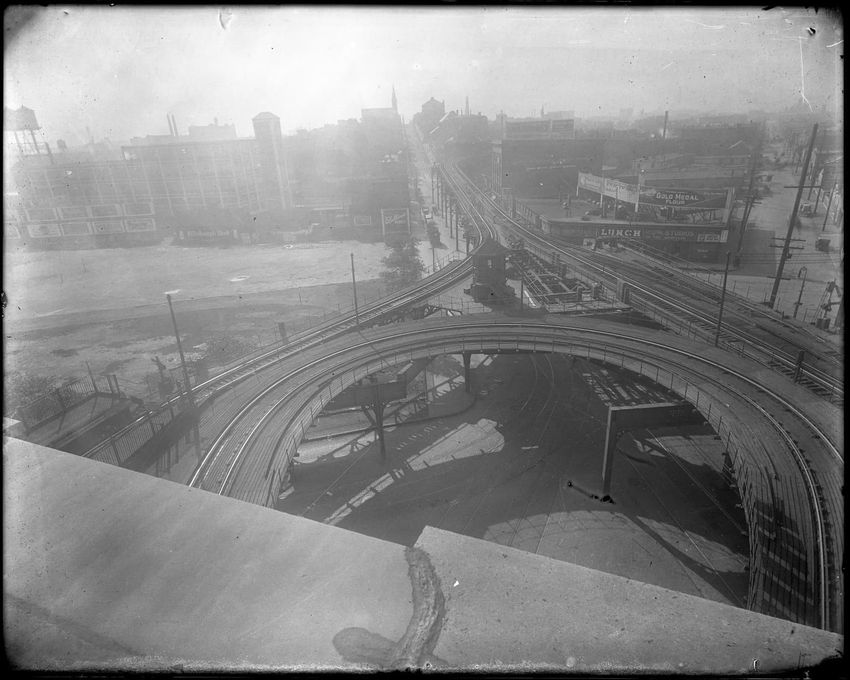 Birds Eye View of the Area. Dark Neg. Signs, buildings, 'el tracks.'