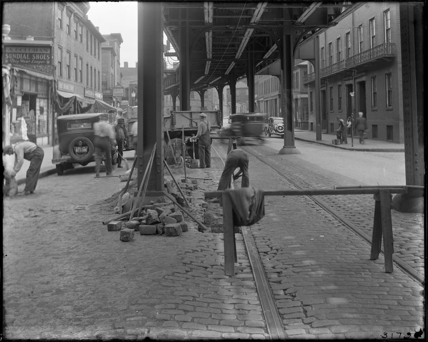 Opp. 152 Main Street. Construction workers, 'El' structure, vehicles, shops, people.