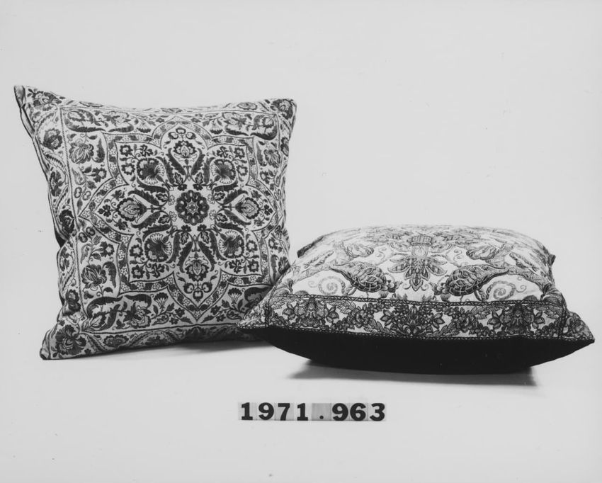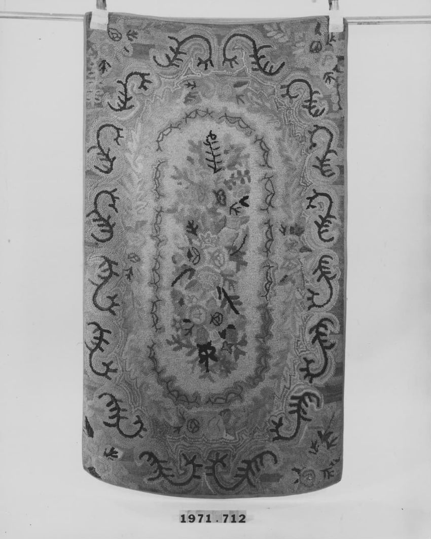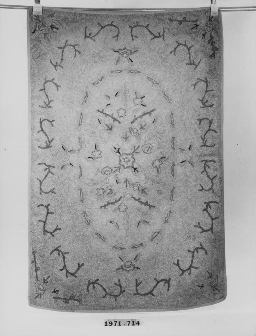 Rectangular machine hooked and shirred rug with oval floral center, surrounding scroll and random exterior floral elements; beige background, salmon, tan, gray decoration; unound.
