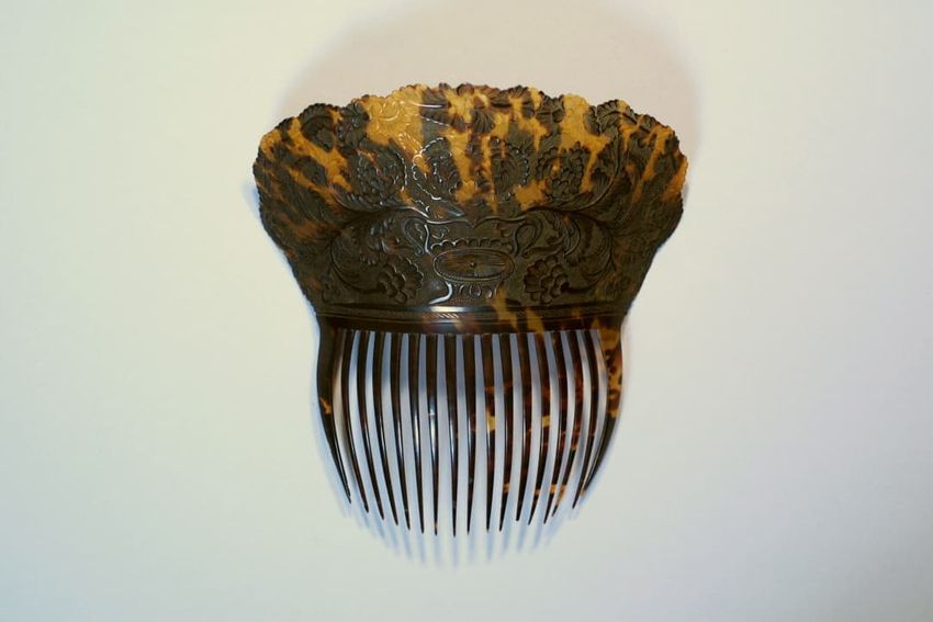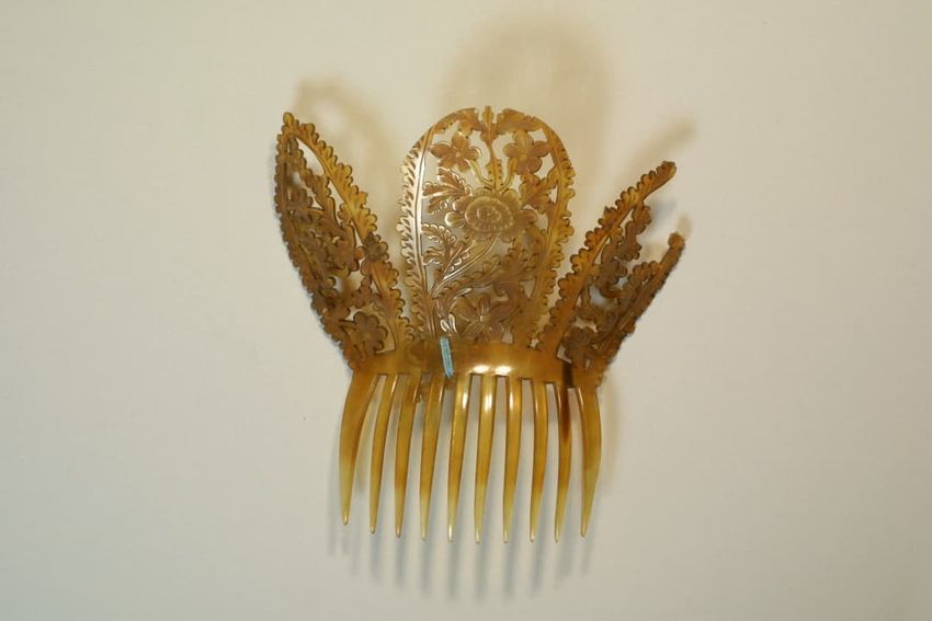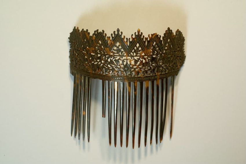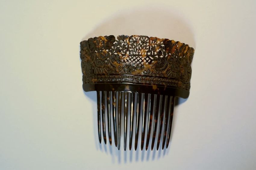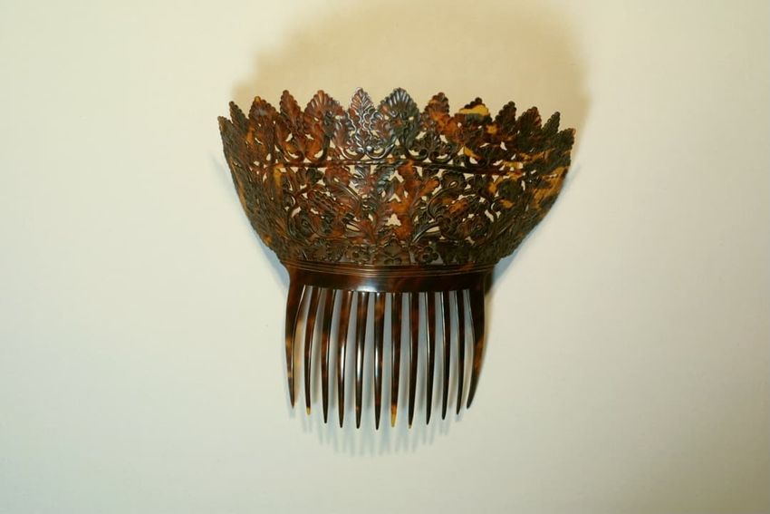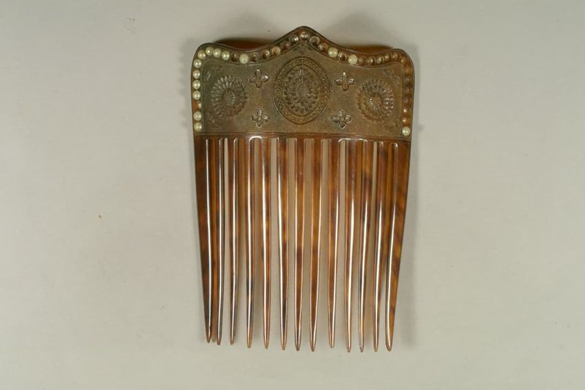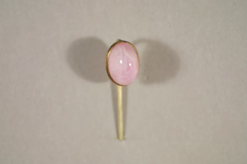 This shield-shaped gold pin is embellished with a roaring lion in the center, surrounded by the French phrase "DIEU ET MON DROIT," which is the motto of the British Royal Family.