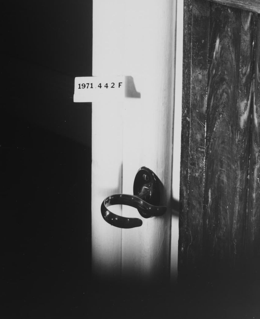 Original laths for cornices; elongated rectangular board with two notches cut into front to receive valance and with two ends and one medial brace notched to receive curtain rods.