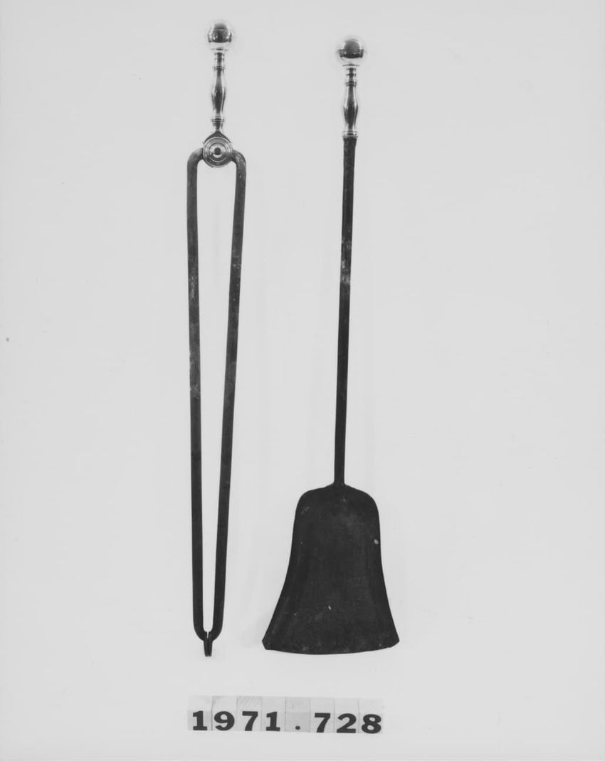 Spherical brass finial has two incised rings at center; ring turned handle below; tongs have circular brass ring, from which extend two round iron shafts; these terminate in ovoid plates.