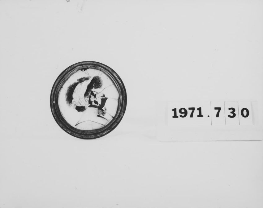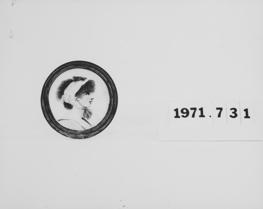 Circular mirror knob (presently used as a cloak pin) has enamel portrait on front; white ground with transfer print and hand-colored portrait of woman seen in profile; dark curly hair, white scarf, yellow dress; circular copper mount or lip; turned copper shaft terminates in screw ending.