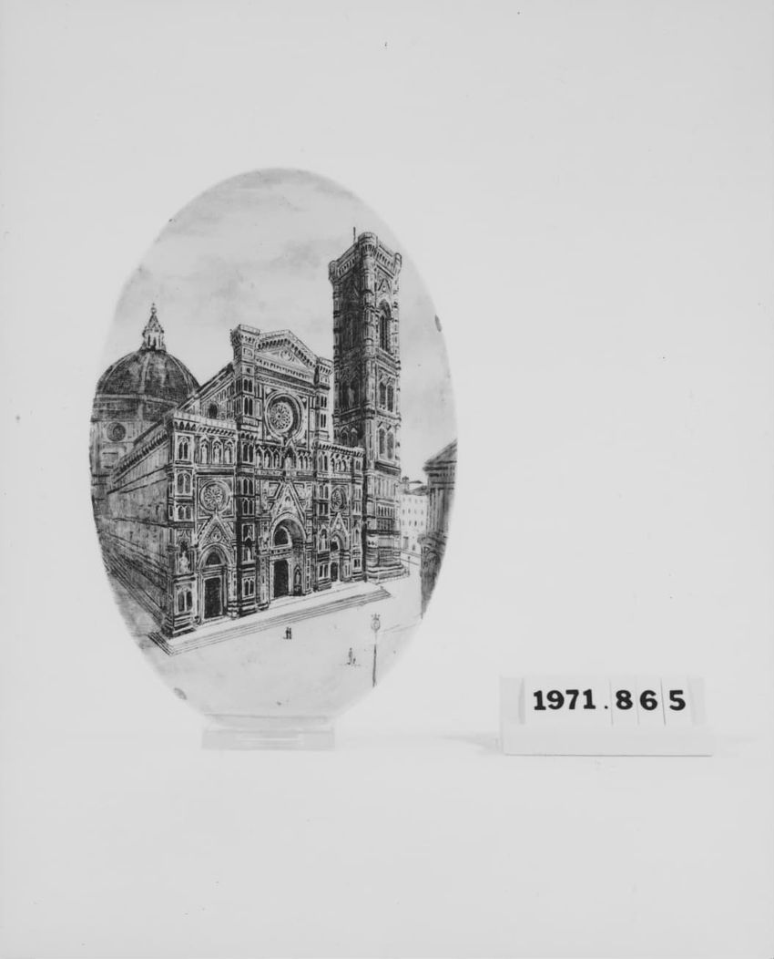 Shallow oval dish; no foot; depicts the front facade of the Duomo in Florence.