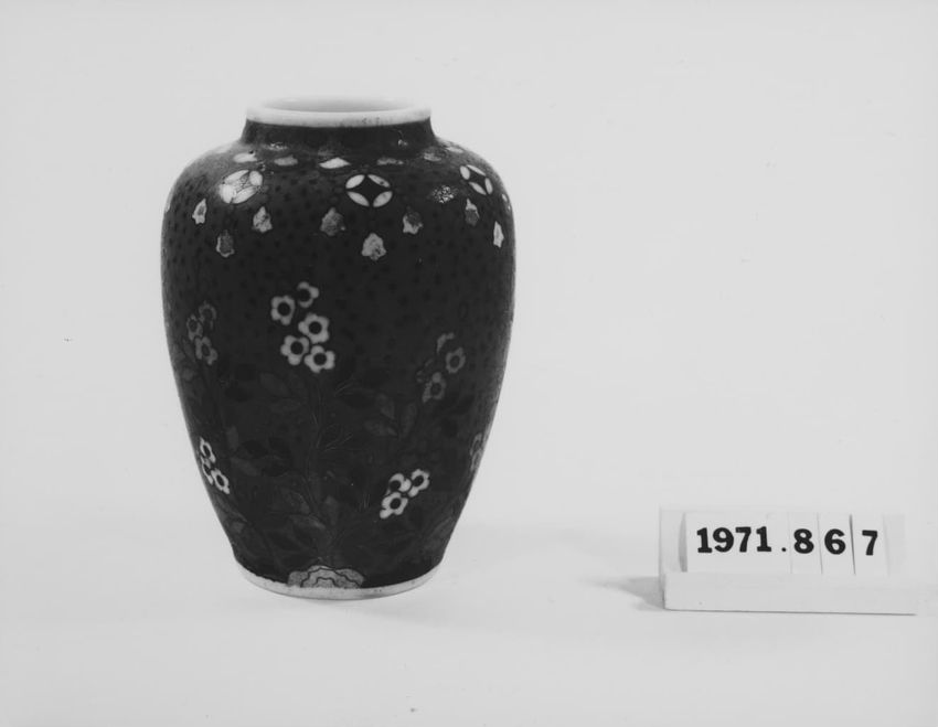 Ovoid shape, rounded shoulder, short neck, turquoise ground with flower and butterfly design, brass fragments scattered over ground.