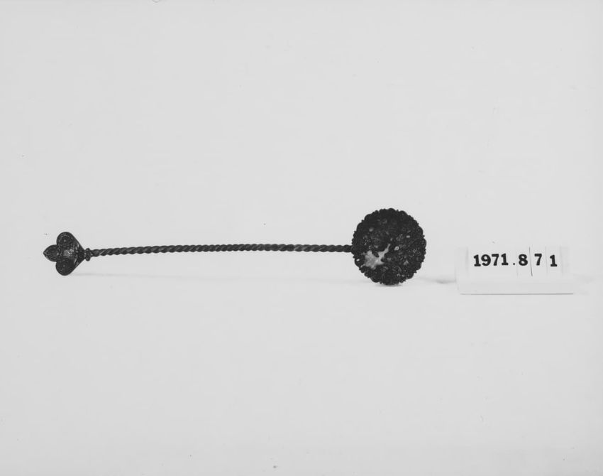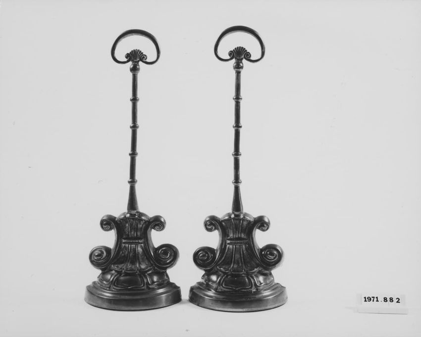 Cast brass hemispherically shaped base, surmounted by ornament with flanking volutes, projecting brass rod with C-shaped handle finial, base filled with lead.