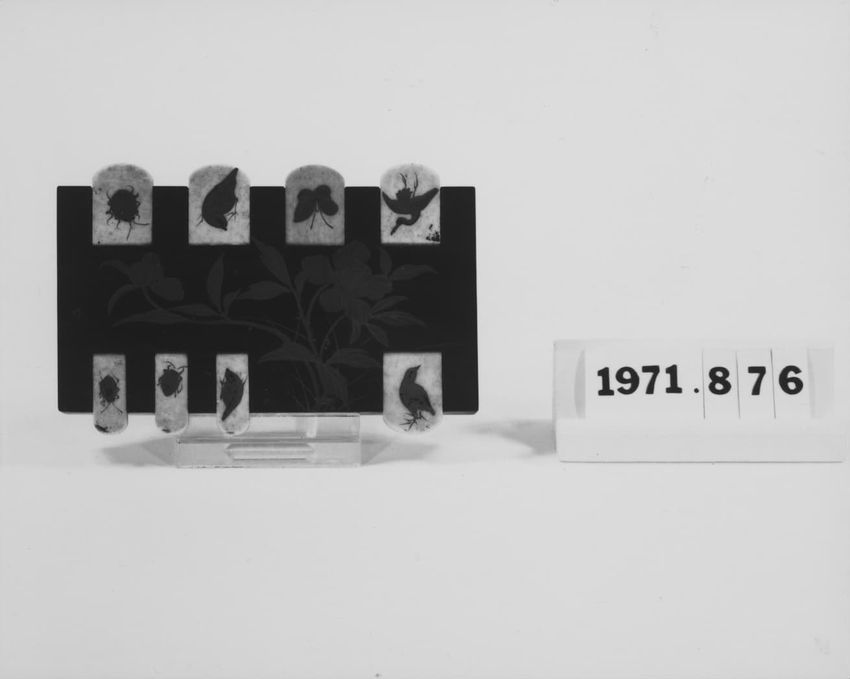 Rectangular slab of wood with movable ivory tabs at edge, tabs decorated with gilded insects and birds, a floral sprig on top.