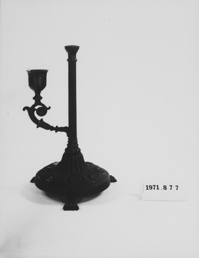 Tripod paw feet, cylindrical base, reeded column with projecting arm and candle socket; section surmounting column missing; design shows classical influence.