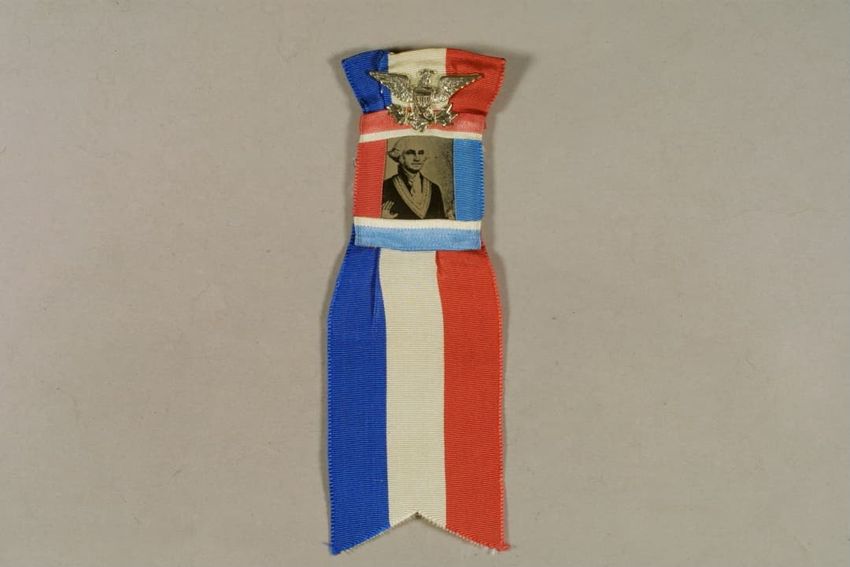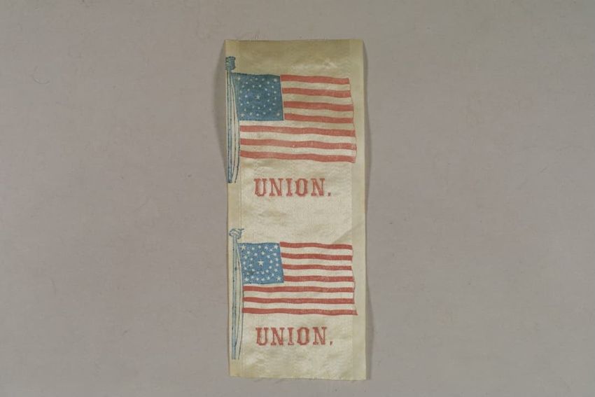 White silk ribbon with wide, centered satin-weave stripe on a plainweave ground. Ribbon is block printed with two repeats of an American flag flying on a pole, facing proper left, in red and blue (white is the ground textile showing through), with the word "Union." in block letters beneath. Each fl...