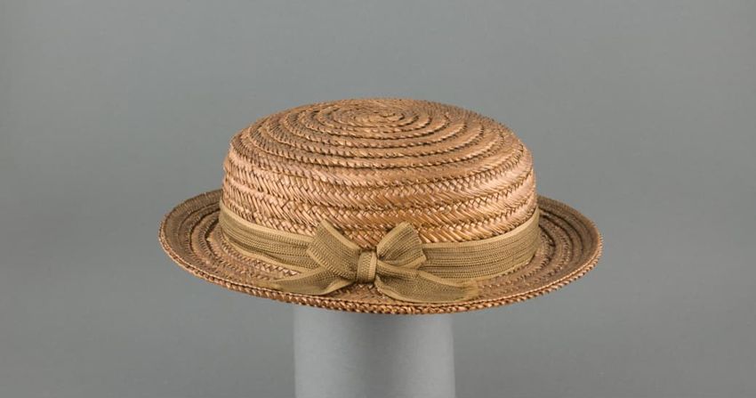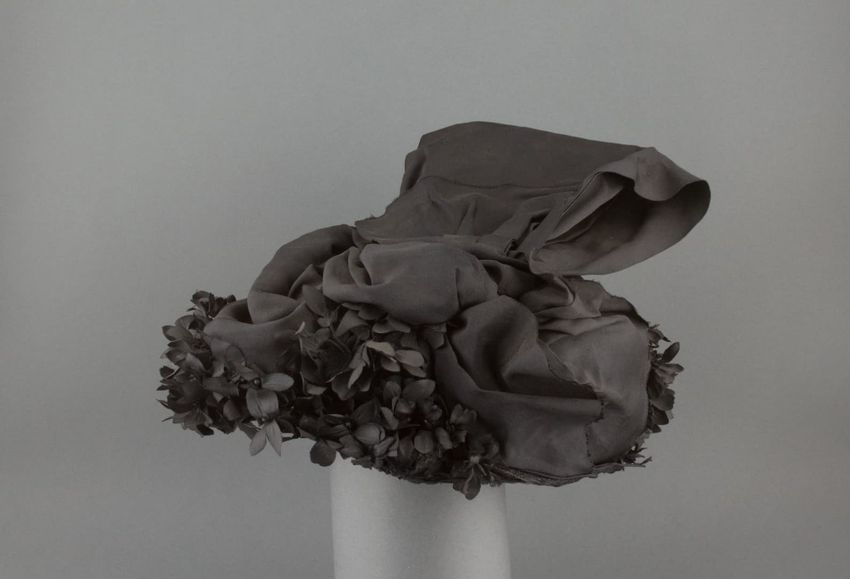 Purple horsehair hat with tulle and wire foundation, pleated brim trimmed with blue/gray cotton flowers, large bow at back of purple moiré ribbon, and padded crown lined with black silk and velvet.