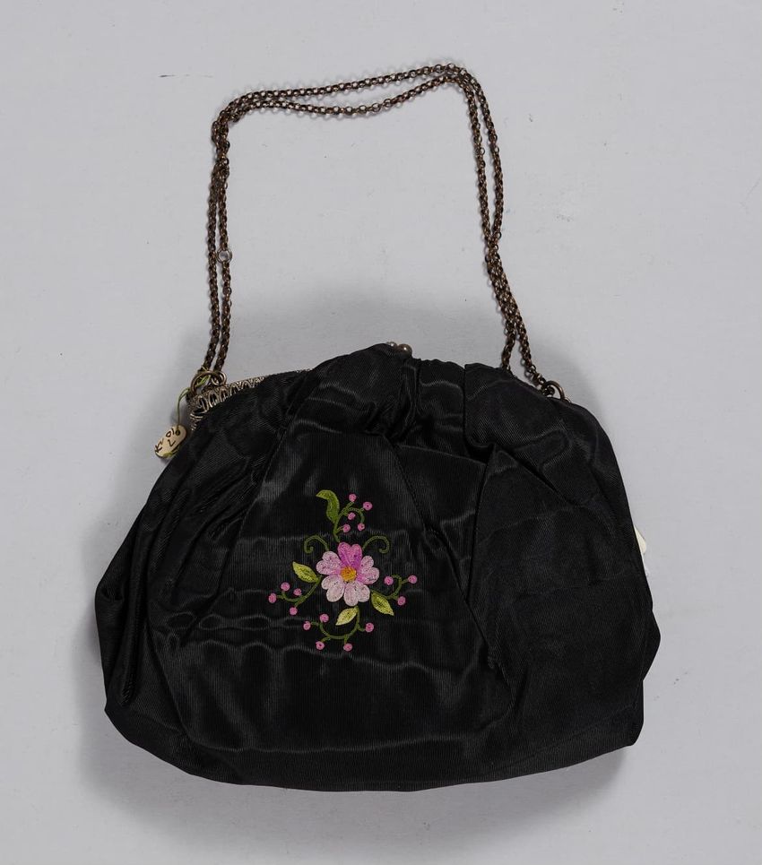 Black silk crepe embroidered with black silk; narrow outer meander border; large border with floral meander with corner motifs of 8" square; ground has sprigs.