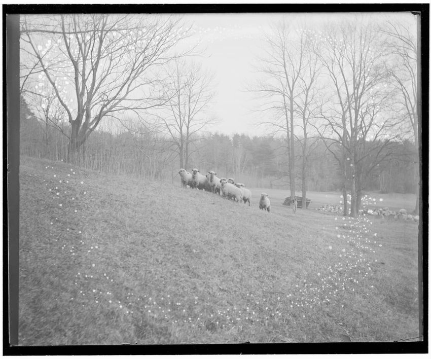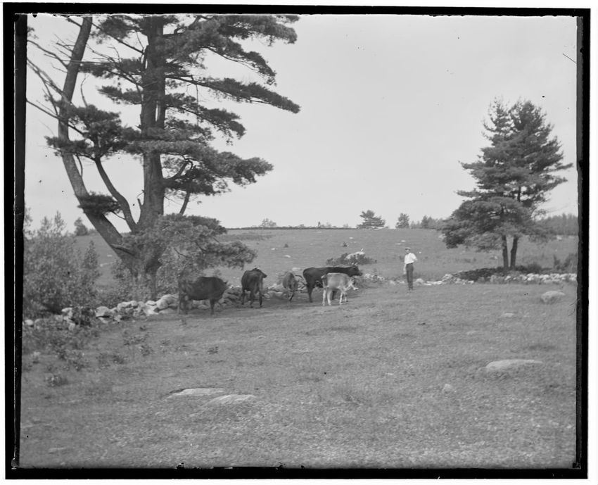 The image shows a rural scene in Milton, Massachusetts, featuring cattle grazing in an open field. In the foreground, there is a stone wall, and a small pond is visible nearby. Trees and a house can be seen in the background, all set against a backdrop of rolling hills.