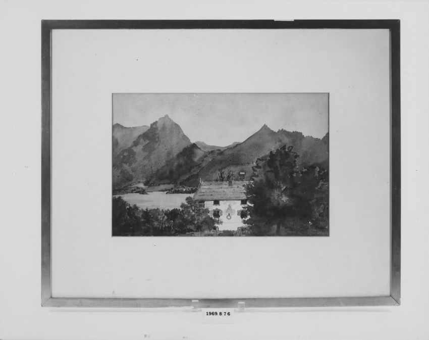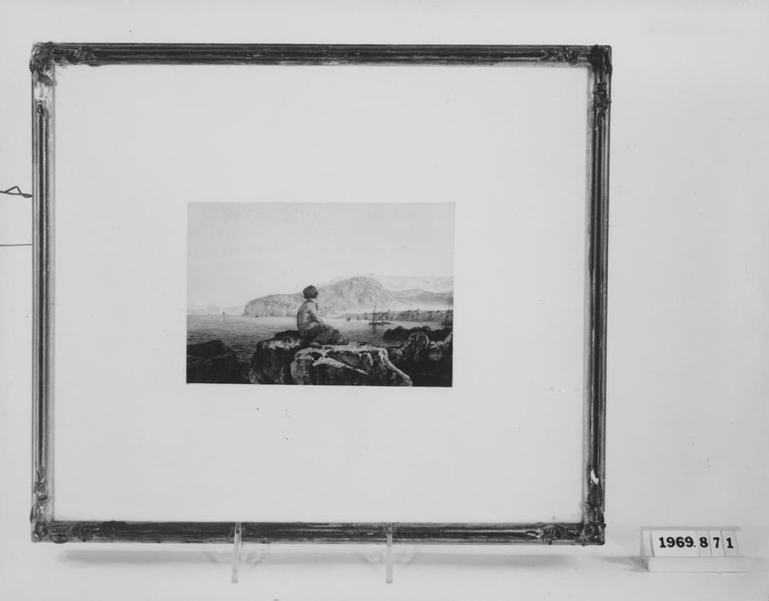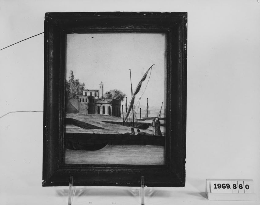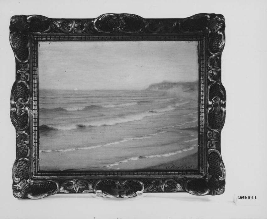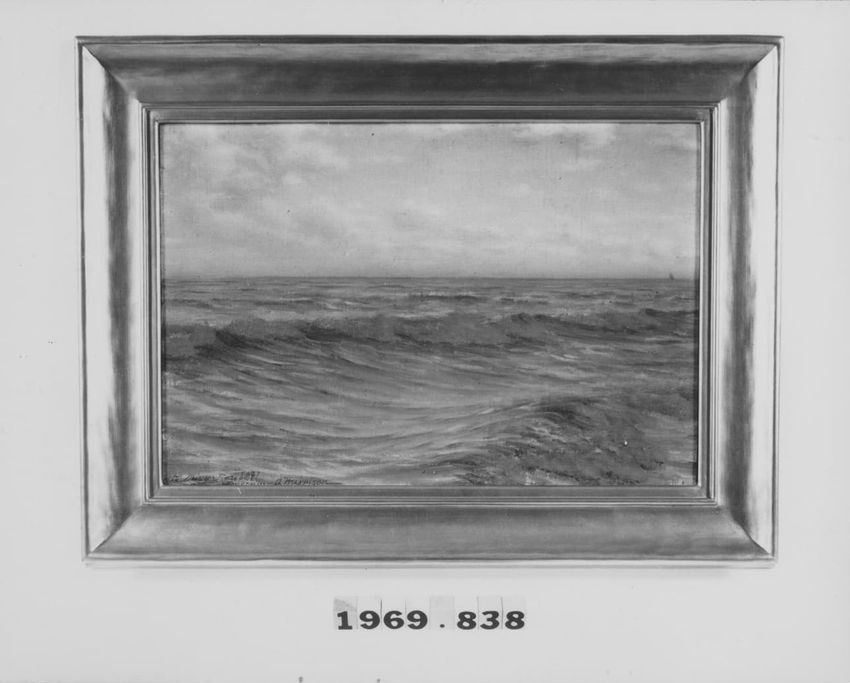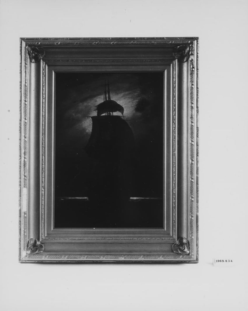 Grey, gold, and white; oval format; large sailboat, rt; rowboat, left; choppy water