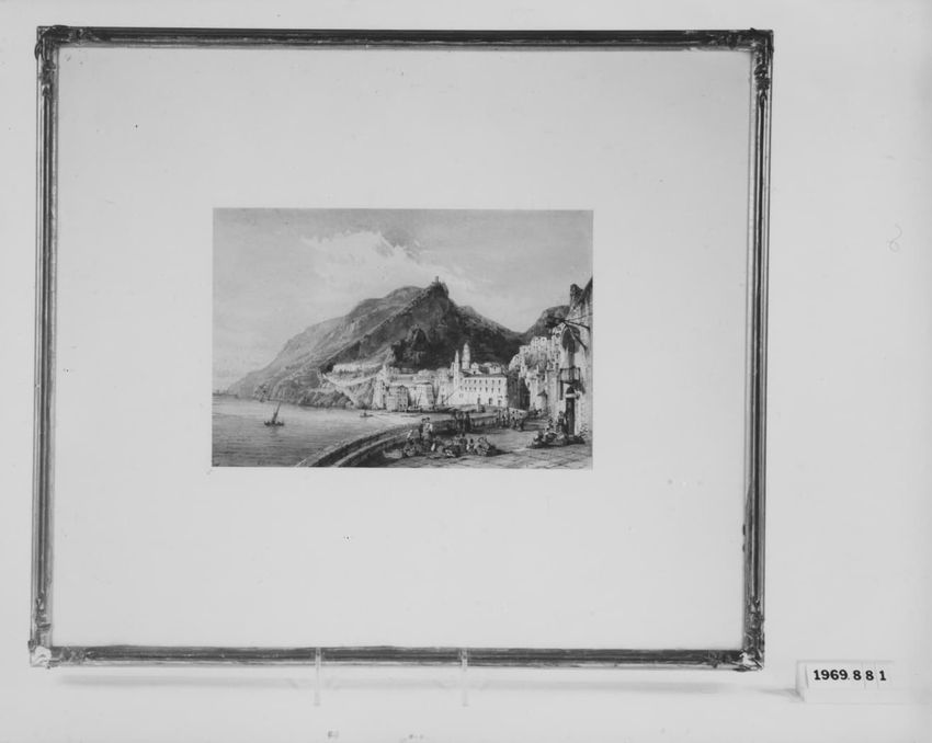 Landscape with castle, cathedral and pedestrians to left; boats on right. Blues, greens, burnt siena, beige.