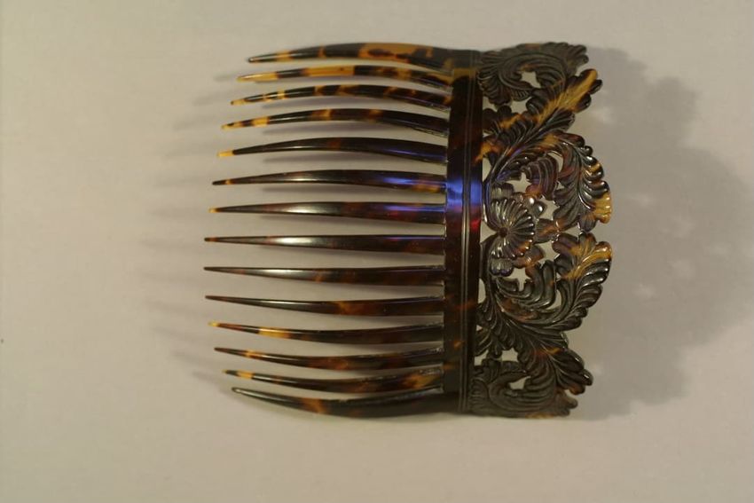 Tortoiseshell hair comb with pierced carved foliate decoration.