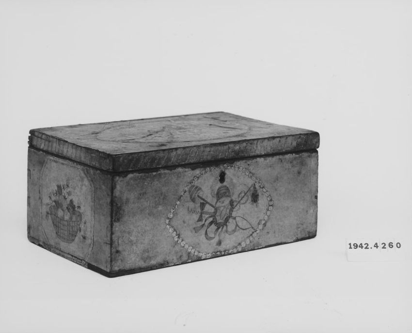 Shelf clock. Marble pedestal base with convex circular eglomise panel over watercolor drawing insert of iron bridge over water; surmounted by mahogany framed clock with enamel face, engraved on back "Wm More/Boston/Feb 15th/1806." Watercolor drawing titled "COALBROOKDALE IRON BRIDGE."