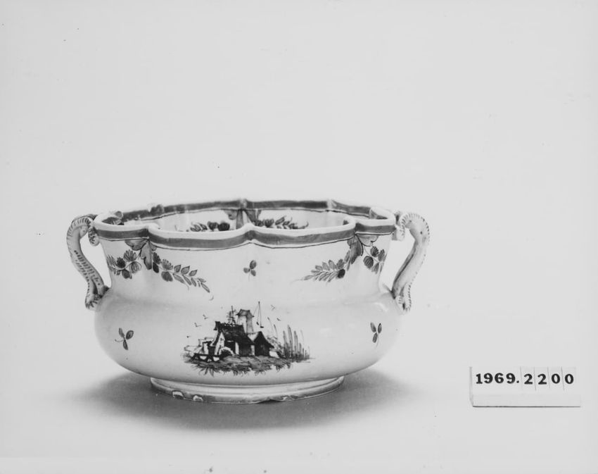 Wht, green, yellow; curvd side, scalloped mouth, interlace hndl; mill/f