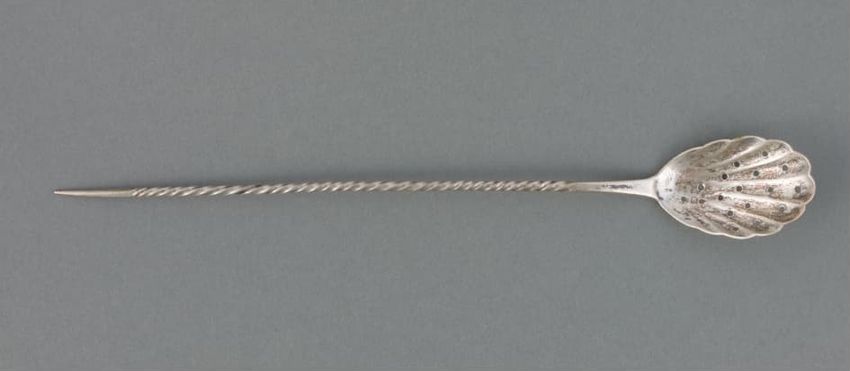 Silver lemonade spoon. Twist handle with a pierced fluted bowl.