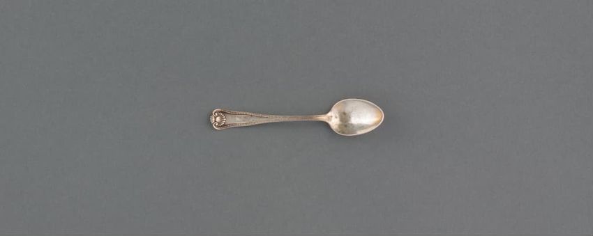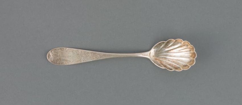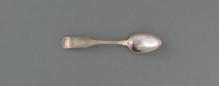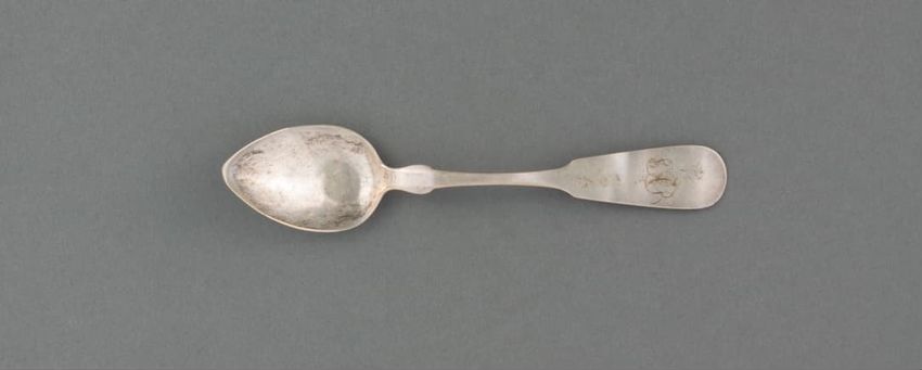 Silver teaspoon with a spatulate handle, rounded shoulders, and pointed oval bowl.