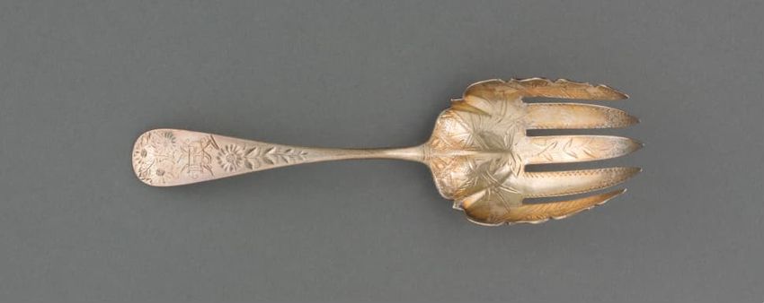 Silver serving fork with an oval handle and five tines. Floral and foliate design.
