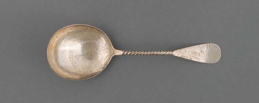 Silver serving spoon with a rounded handle, twist shaft, and oval bowl. Foliate design.
